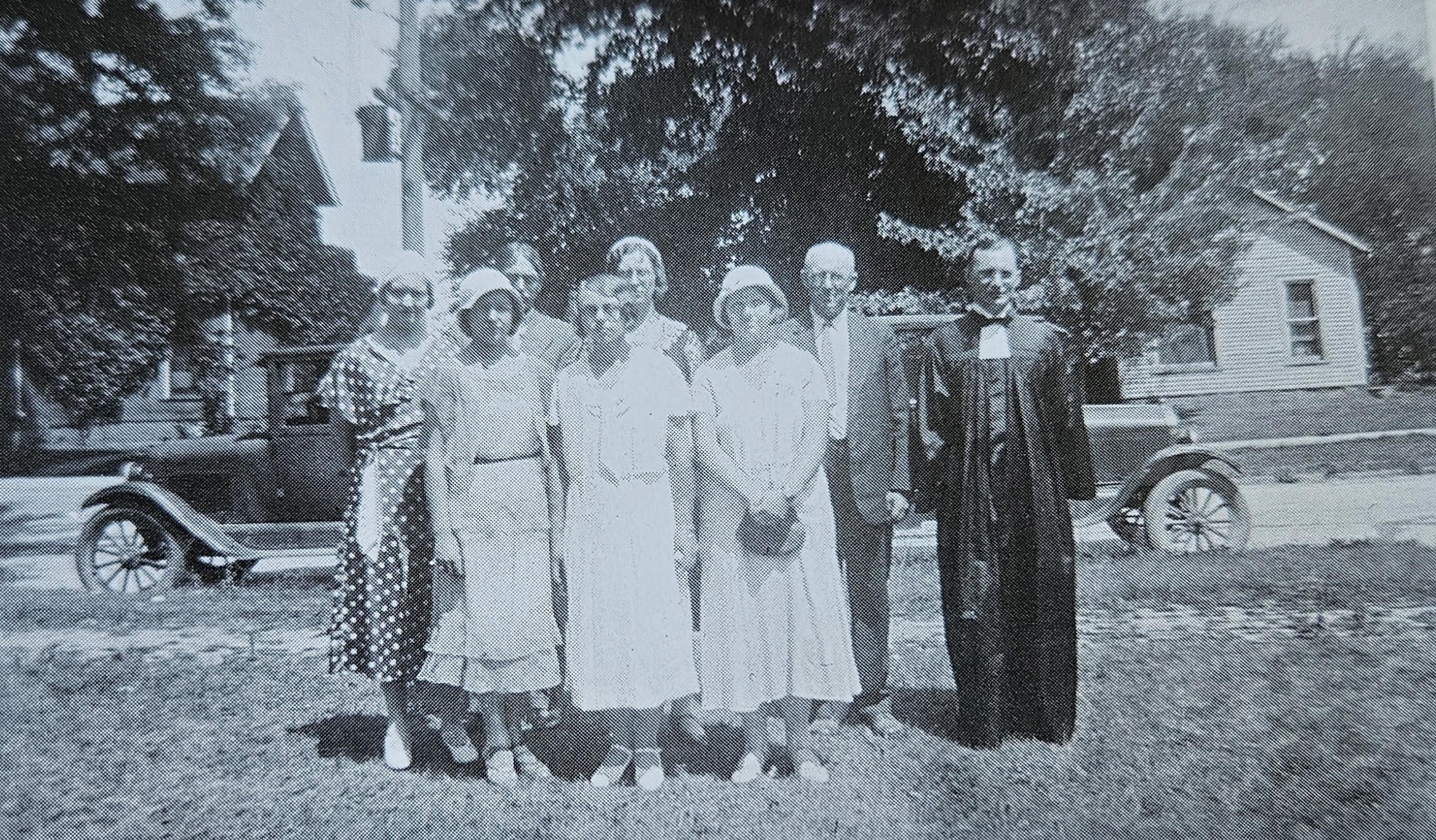 Shown left to right are: Miss Secrist, pianist; Mrs. Lavanche Ort, S.S teacher; Mr. William Panning, Elder; Miss Laurena Panning, S.S. teacher; Mrs. Emma Bartels, Miss Velma Ricker, Mr. Henry Vagen, The Rev. R.T. Mueller.