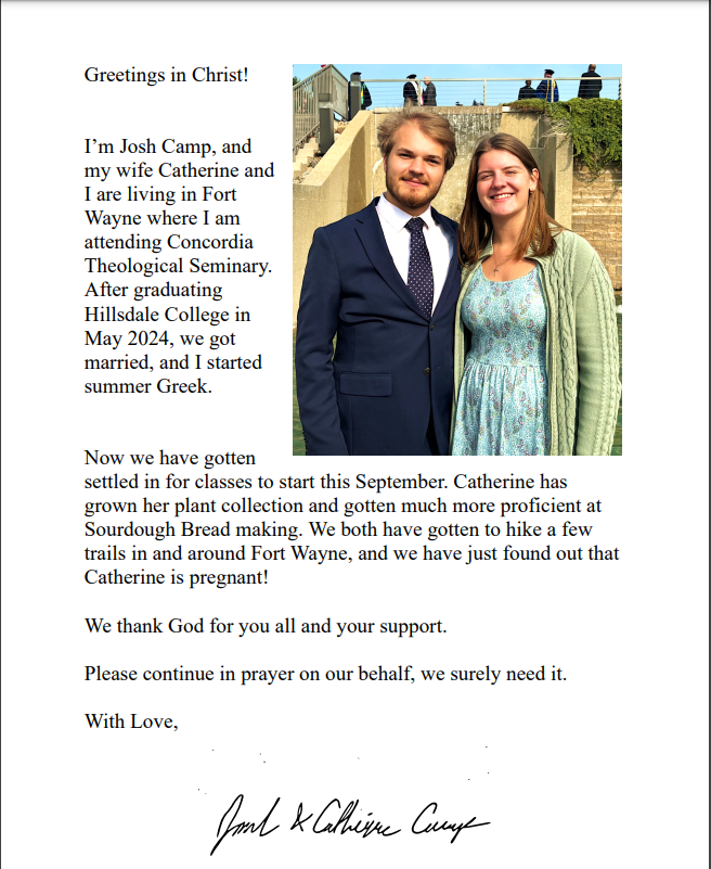 Joshua Camp is the seminarian whom our congregation will sponsor 2025-6. He is from Zion Lutheran Church in Mt. Pleasant, MI. and is now in his second year at Concordia Theological Seminary, Fort Wayne, IN. He is married to Catherine. The Camps have recently been blessed with their first child, whose name is Gideon.